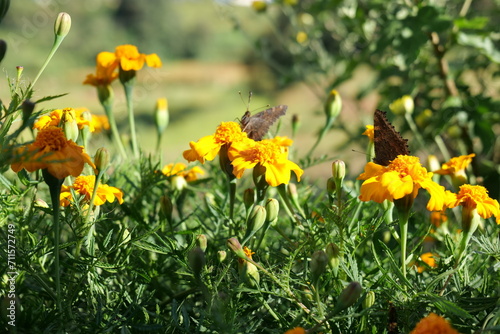 Obraz premium Speckled wood butterflies on vibrant marigolds