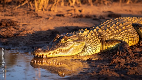 © Zaenal, Naklejka premium Spectacled Caiman Basking in Golden Sunset Light