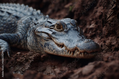 © Lubos Chlubny, Fototapeta premium Spectacled caiman resting on river bank in pantanal wetlands