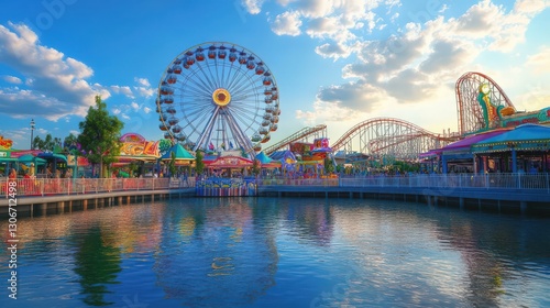 Obraz premium Spectacular amusement park scene with ferris wheel, roller coaster and water