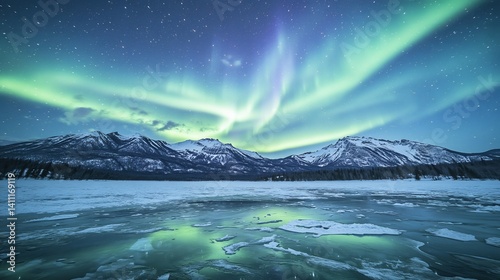 Naklejka premium Spectacular aurora australis lighting up sky over snow covered mountain range green purple ribbons of light swirling above faint stars scattered across deep blue sky icy landscape reflecting lights
