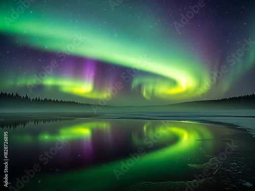 © Concept Studio, Obraz premium Spectacular aurora borealis dancing with vibrant green and purple hues reflected in a calm, icy body of water under a starry sky, showcasing nature's breathtaking light show