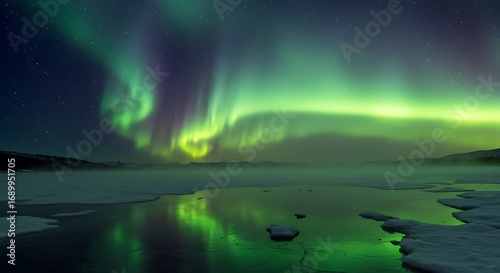 Naklejka premium Spectacular aurora borealis display over a partially frozen lake, reflecting...