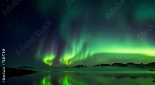 © Hooh, Naklejka premium Spectacular aurora borealis display over tranquil waters at night
