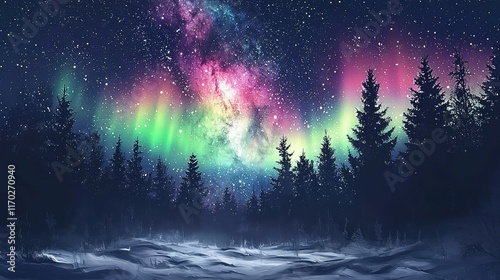 Naklejka premium Spectacular Aurora Borealis over a Snowy Forest Landscape at Night