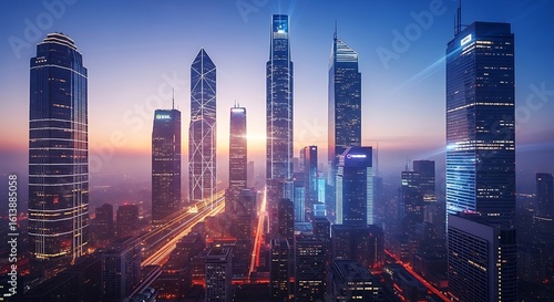 © Lea, Fototapeta premium Spectacular cityscape view with illuminated skyscrapers against a vibrant skyline