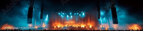 © Alexey, Fototapeta premium Spectacular concert with dynamic stage lights and excited crowd at night. Generative AI