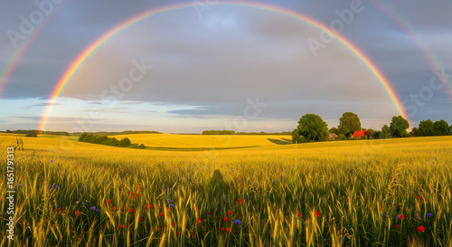 © Aryanza M Averroes, Naklejka premium Spectacular double rainbow arching over a vibrant golden field with red poppies and blue cornflowers