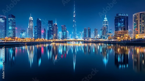 Naklejka premium Spectacular Dubai Skyline at Night, Reflections on the Water, Urban Glow
