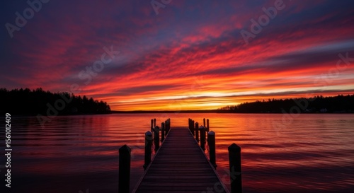 © Maruf, Fototapeta premium Spectacular fiery sunset paints the sky over a calm lake with a wooden pier