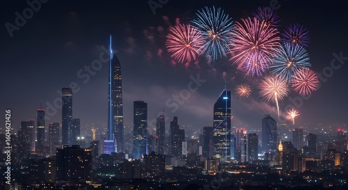Fototapeta premium Spectacular fireworks display illuminating a modern city skyline at night during a vibrant celebration.