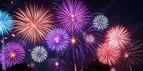 Naklejka premium Spectacular fireworks display with vibrant bursts and colors illuminating the...