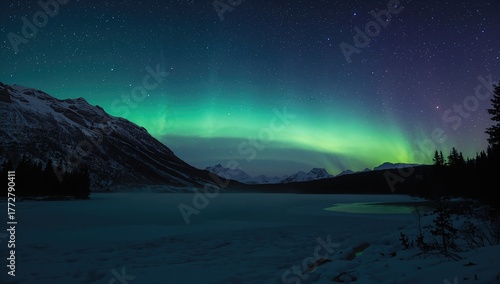 © vxnaghiyev, Naklejka premium Spectacular green lights shimmering over a natural terrain
