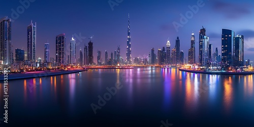 © alexsa, Fototapeta premium Spectacular illuminated cityscape of Dubai at night with water reflections
