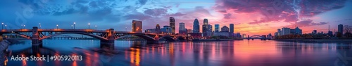 © liang, Fototapeta premium Spectacular Minneapolis Skyline at Dusk Over the Mississippi River, Highlighting the Historic Stone Arch Bridge in a Serene Urban Landscape.