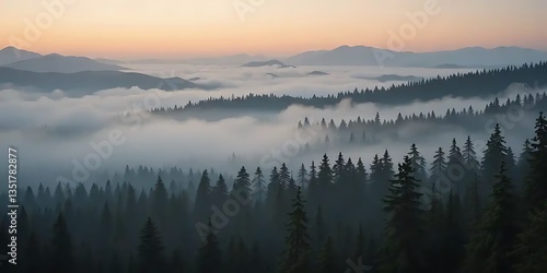© Putra, Fototapeta premium Spectacular mountain scenery with majestic forest shrouded in morning mist