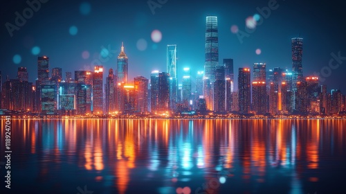 © Vitalii, Obraz premium Spectacular night cityscape with illuminated skyscrapers reflecting on water