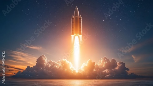© Ndoomyim, Fototapeta premium Spectacular night rocket launch into a starry sky with illuminated clouds