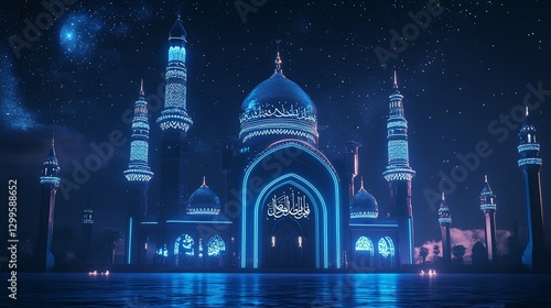 © Berkah, Fototapeta premium Spectacular Night View of a Blue Lit Mosque with Starry Sky Background