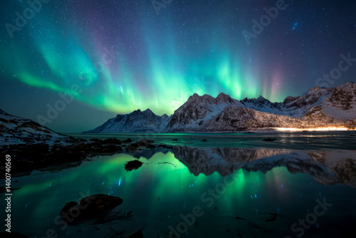 Obraz premium Spectacular Nighttime Aurora Over Lofoten Islands, Norway