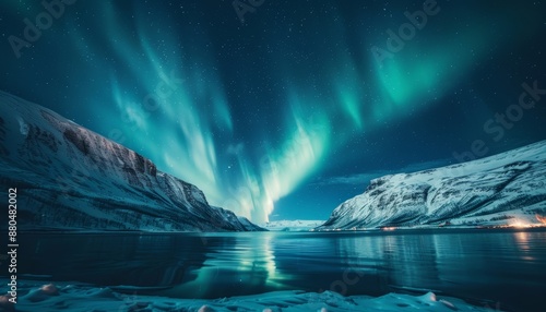 Naklejka premium Spectacular Northern Lights Over a Snow-Covered Mountain Range