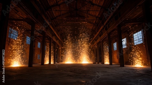 © Bussakon, Obraz premium Spectacular orange pyrotechnic bursts illuminate a dark cavernous industrial loft space with structural columns and