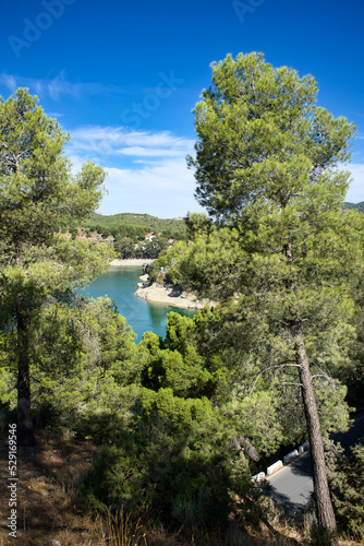 © ruthlaguna, Fototapeta premium Spectacular panoramic views of the Guadalhorce reservoir, next to the Caminito del Rey in Malaga, Spain. Turquoise blue water and forest with blue sky on a sunny day.