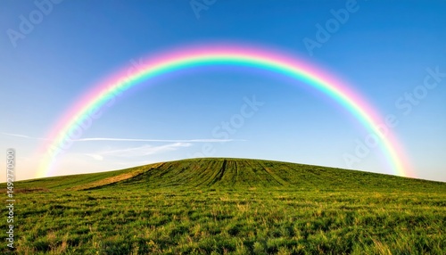 Naklejka premium Spectacular rainbow appears over rolling green hills nature scene vibrant landscape daytime scenic view
