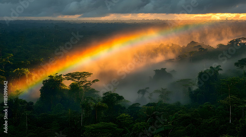 Naklejka premium Spectacular Rainbow Arcing Over a Misty Rainforest at Sunrise