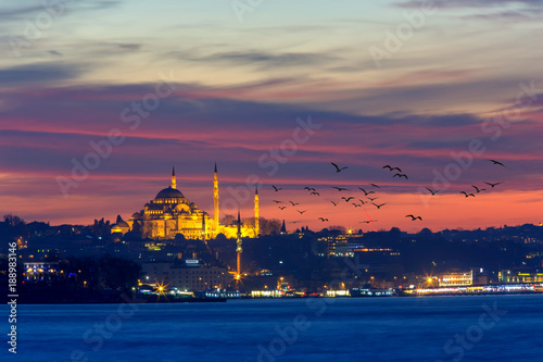 © yusuftatliturk, Obraz premium Spectacular Süleymaniye mosque and moon set istanbul Turkey