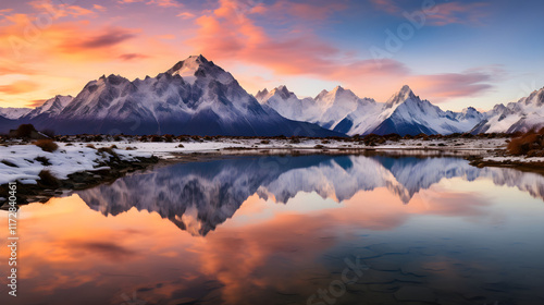 © Brett, Fototapeta premium Spectacular Scenic View of Snow-Capped Mountain Range, Lush Green Slopes, and a Crystal Clear Lake