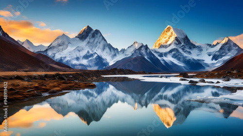Fototapeta premium Spectacular Scenic View of Snow-Capped Mountain Range, Lush Green Slopes, and a Crystal Clear Lake