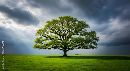 Obraz premium Spectacular single oak tree on green field under moody dramatic clouds