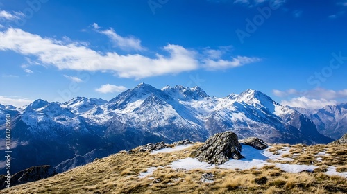 © Generative AI, Fototapeta premium Spectacular Snowy Mountain Range Under Bright Blue Sky in Scenic Winter Landscape : Generative AI