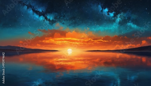 © NguyenThi, Fototapeta premium Spectacular Sunset Over Lake with Reflection