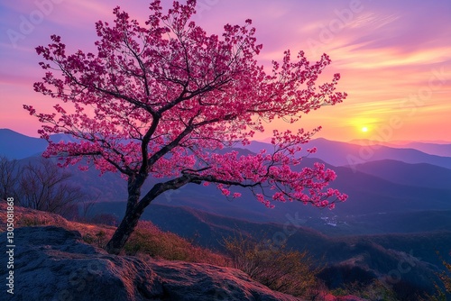 © mhdws, Fototapeta premium Spectacular sunset over pink cherry blossom tree mountain view nature photography tranquil environment