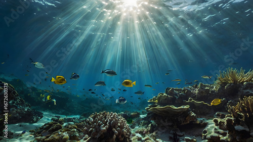 Fototapeta premium Spectacular view of a sunlit coral reef with a school of diverse tropical...