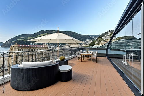 Fototapeta premium Spectacular view of San Sebastian in Spain from a penthouse terrace, generative ai