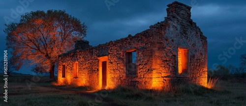 © tongpatong, Fototapeta premium Spectral flames illuminate a ruined stone building.