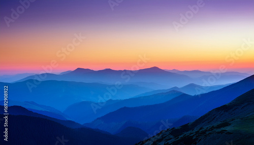 © Orion, Fototapeta premium Spectral Gradient Of Mountain Ranges At Sunset With Multi Layered Atmospheric Perspective