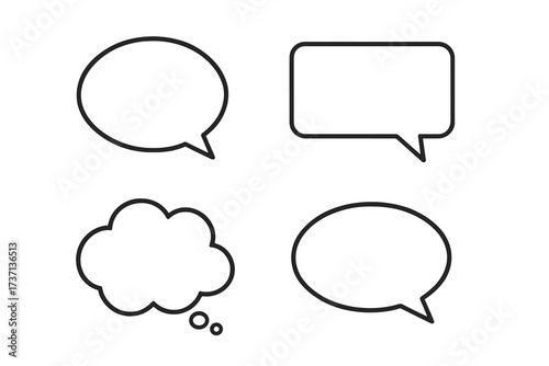 © Mia, Fototapeta premium Speech bubble vector icon set. Talk chat box, message balloon, dialogue bubble. Thinking, speaking, communication symbol. Comic doodle element. Simple outline design.
