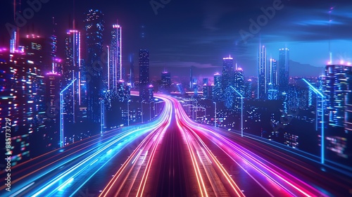 © Alief Shop, Fototapeta premium Speed light trails path through smart modern mega city and skyscrapers town with neon futuristic technology background