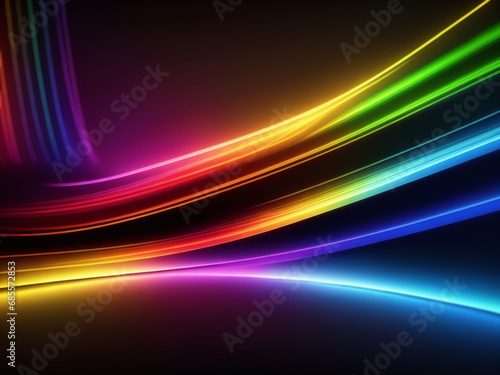 © sutthichai, Naklejka premium speed motion blur purple red blue yellow road black background and sun shine. generative ai