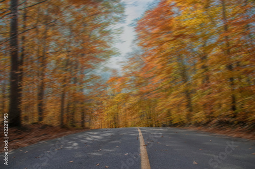 Obraz premium Speeding down centre line of tree-lined road autumn foliage nobody
