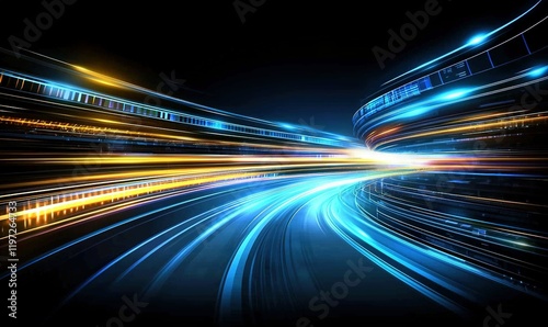 © Resni AI, Obraz premium Speeding light trails on curved highway at night with digital data stream