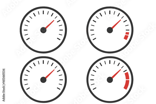 © Frida, Naklejka premium Speedometer gauge collection with red indicator levels. Performance measurement icons for dashboard UI. Concept of speed, risk, progress, and rating. Vector illustration set.