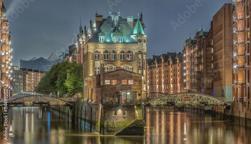 Fototapeta premium Speicherstadt in Hamburg bei Nacht mit Lichtern und Spiegelungen im Wasser