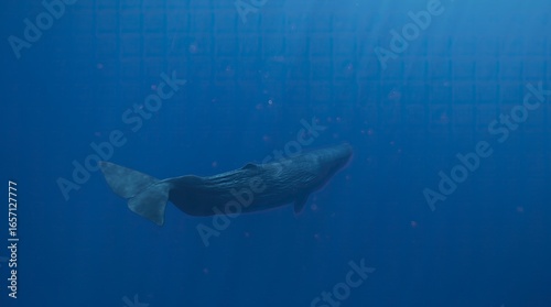 Fototapeta premium Sperm whale swimming underwater, massive marine mammal in natural habitat, freediver filming giant whale, stunning ocean wildlife scene, powerful moment of nature, beauty and freedom of ocean life