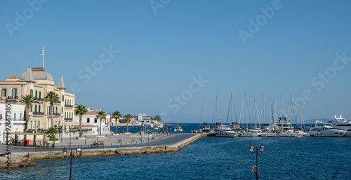 Naklejka premium Spetses island, Greece. Old neoclassical buildings, Yachts and sailing boats anchored at marina, blue sky