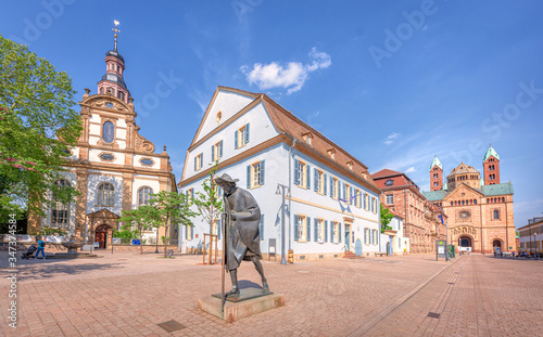 © Thorsten Assfalg, Naklejka premium Speyer Pilgerfigur Fußgängerzone und Dom